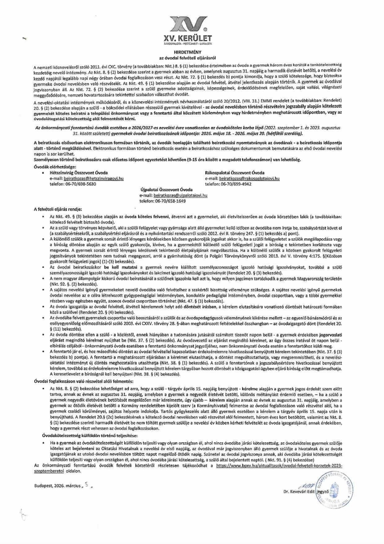 Hirdetmény az óvodai felvételi eljárásról 2026-2027-es nevelési évre